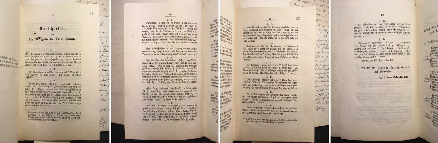 The following is an attempt to assemble the information known about the teaching, the curriculum, the professors, and students during the period between 1831 and 1848. The information has been assembled on the basis of the Vorschriften für die Allgemeine Bau-Schule (Regulations for the Allgemeine Bau-Schule) printed in 1831. This document records the educational outlines of the Allgemeine Bauschule. In the following, this page provides an English translation of the primary source. The known information about the teaching, the curriculum, the professors, and students during the period between 1831 and 1848 is provided through hyperlinked correspondent keywords. By clicking on the links, readers can access the information1