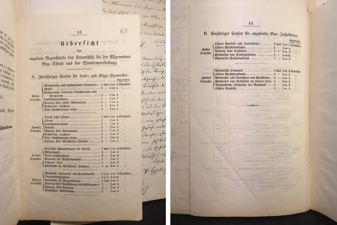 Uebersicht der einzelnen Gegenstaende des Unterrichts bei der allgemeinen Bau-Schule und der Stundenvertheilung” (Overview over the curriculum), in: “Vorschriften für die Allgemeine Bau-Schule“, Berlin, GStA PK, I. HA Rep. 89, Nr. 20399