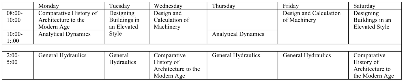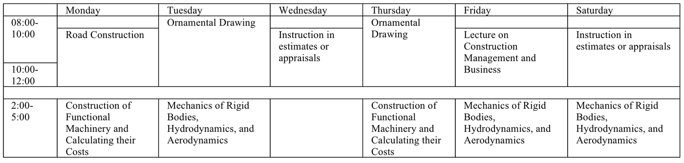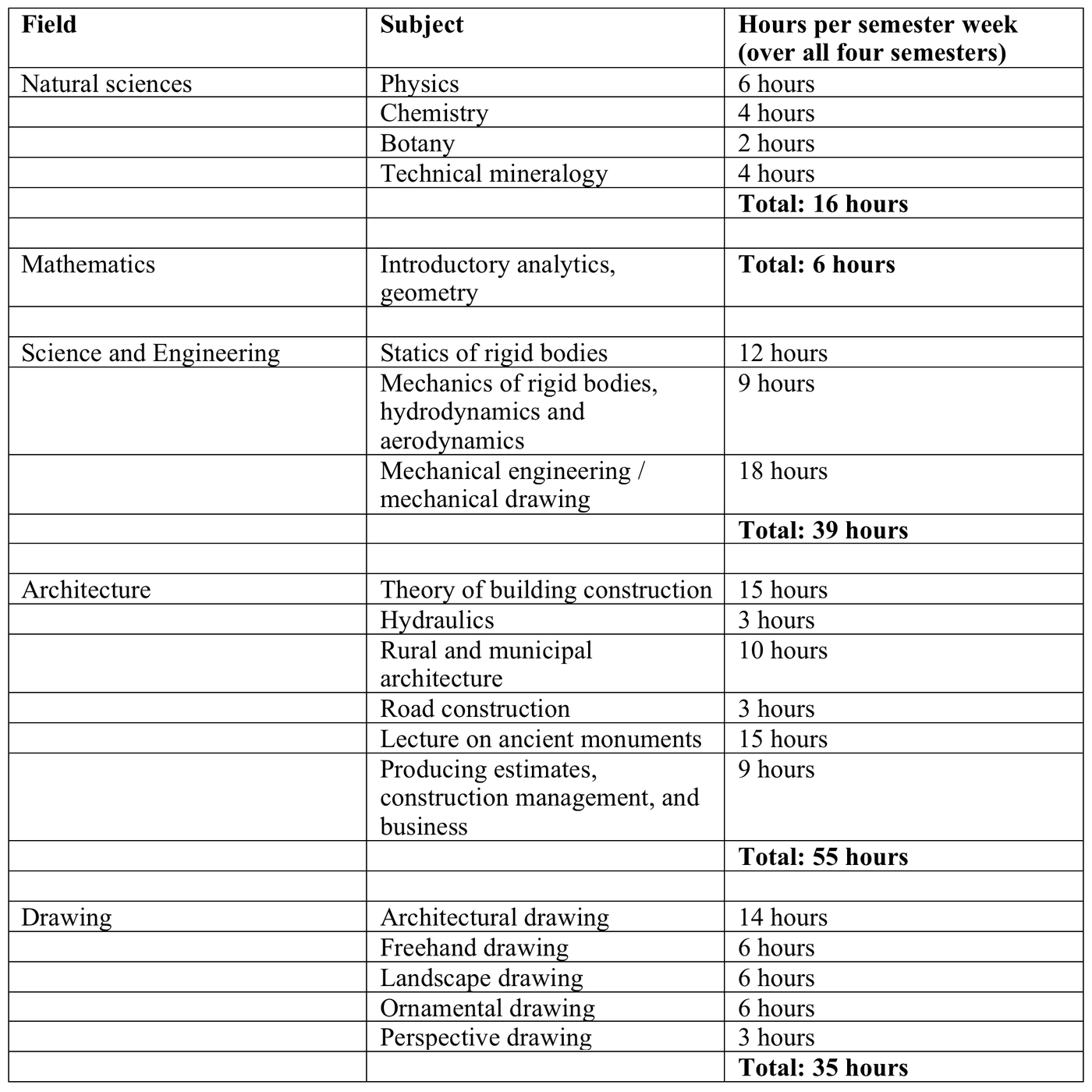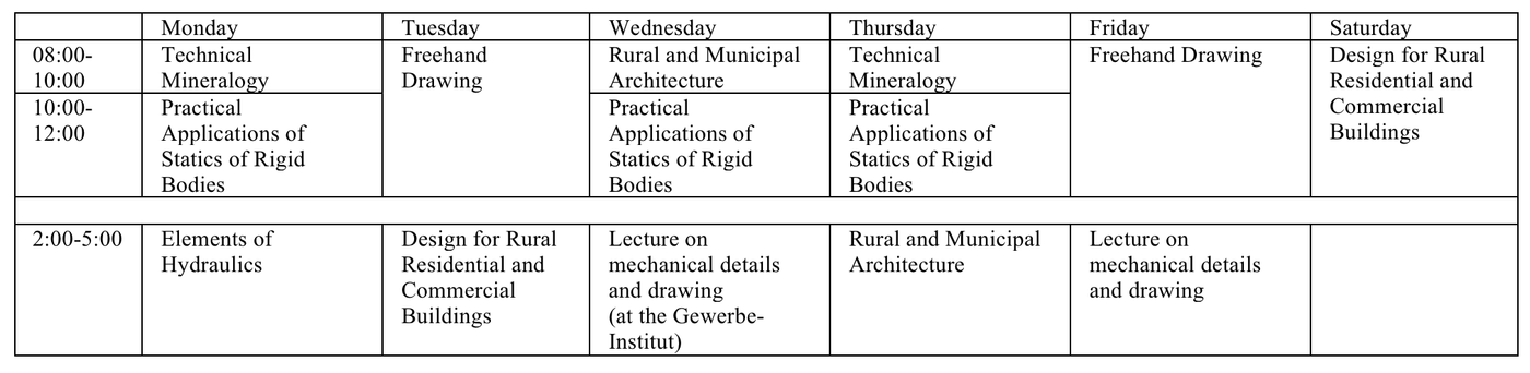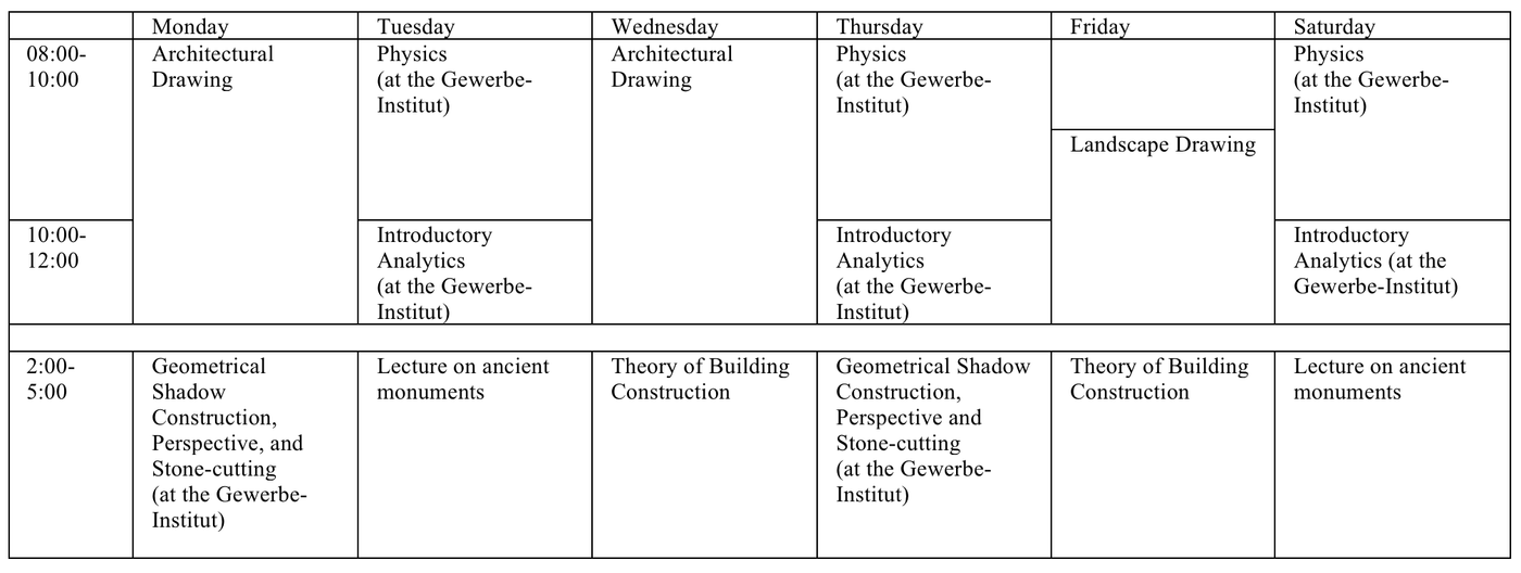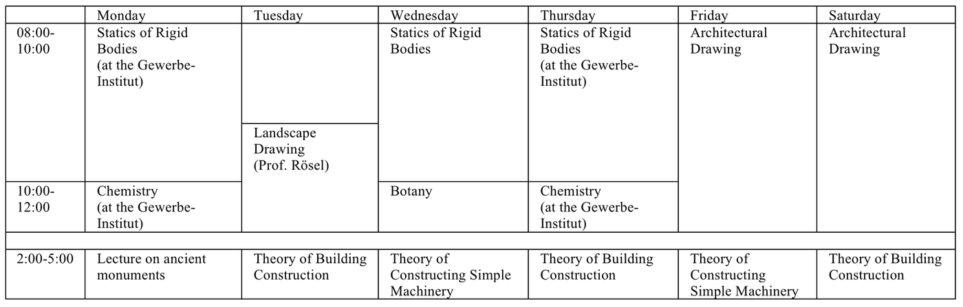 The program at the Allgemeine Bau-Schule was extensive, and there was little free time for the students; depending on the semester, the number of classroom hours varied between thirty and forty-one hours per semester week.