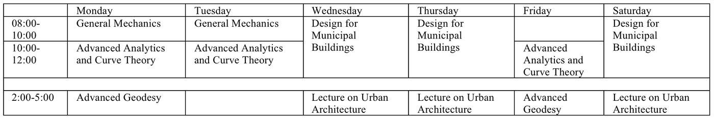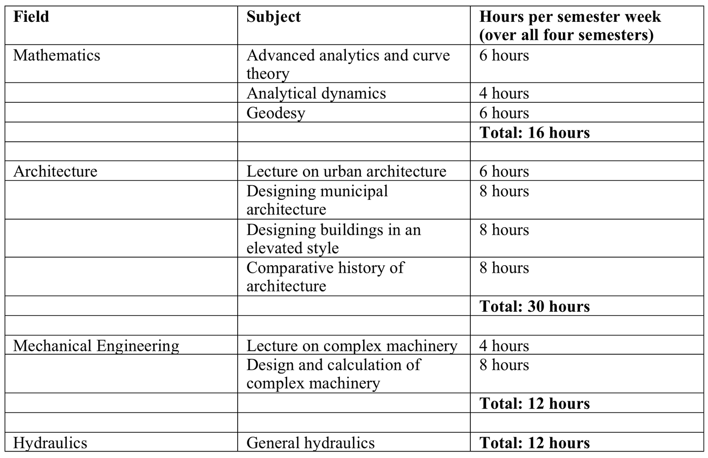 The two-year-long program for the Land- und Wegebaumeister (master of rural architecture and road construction) consisted of the following course structure: