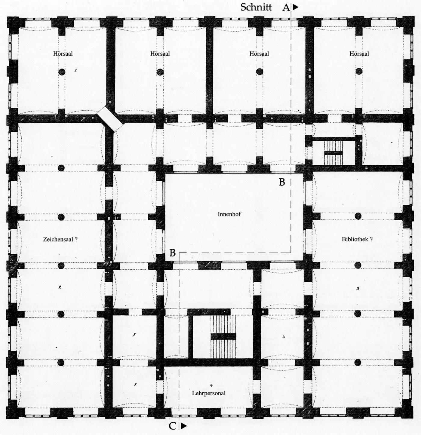 Starting in 1836, classes took place in Schinkel’s newly erected building and—in some departments—at the Gewerbe-Institut. Classrooms in the Allgemeine Bau-Schule were located on the second floor. As the floor plan shows, the second floor also contained unspecified rooms for the faculty and four square classrooms of equal size behind the south façade. On the east side, there was a drawing studio of approximately 33 by 11 meters with five freestanding pillars, and on the west, a slightly smaller library. A corridor running along the courtyard on three sides connected these four areas of the Allgemeine Bau-Schule.